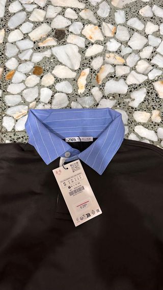 Jersey de Zara con cuello tipo polo y manga larga. Combina un diseño clásico con un toque moderno. - Cuello de camisa a rayas azules. - Cuerpo del jersey en color marrón.