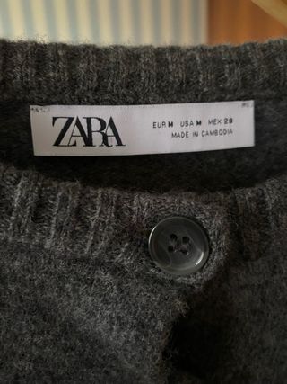 Chaqueta de punto de la marca Zara en color gris. Presenta un diseño de manga larga y cierre de botones. - Dos bolsillos delanteros. - Cuello en V.