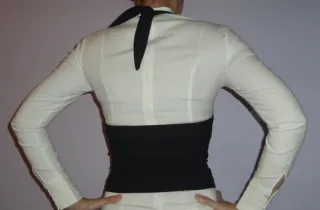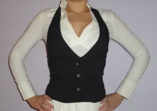 Jersey de cuello alto con espalda descubierta que se ata con dos lazadas. Queda muy bonito. Buen estado