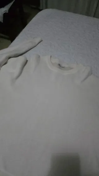 Jersey de Zara en color blanco, talla XL. Una prenda cómoda y versátil. - Diseño de cuello redondo. - Mangas largas. - Bajo y puños elásticos.
