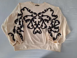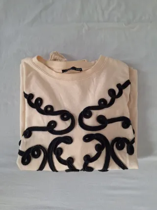 Sudadera de Zara en color beige con un diseño de bordado negro en relieve. - Cuello redondo. - Mangas largas abullonado. - Bordado en relieve decorativo en la parte delantera y mangas.