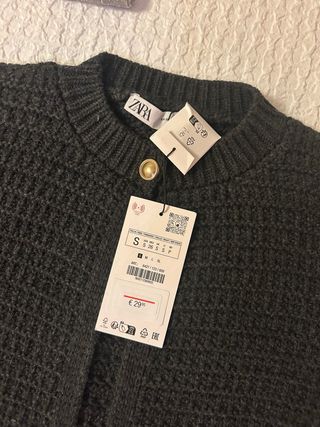 Cardigan de punto grueso en color gris antracita de Zara. Es un modelo nuevo con etiquetas. - Cierre de botón dorado. - Cuello redondo. - Manga larga.
