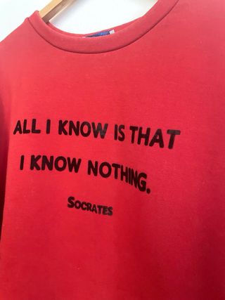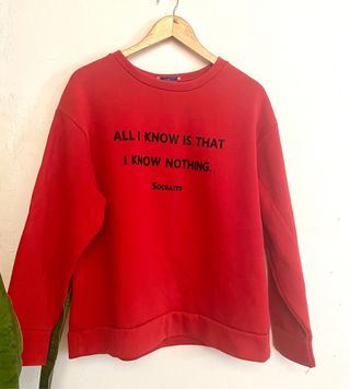Sudadera de Zara con una cita inspiradora. - Diseño de cuello redondo. - Manga larga. - Estampado ALL I KNOW IS THAT I KNOW NOTHING. SOCRATES en negro.
