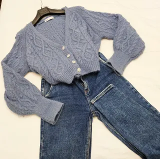Cárdigan de punto con un diseño delicado y elegante. - Tejido suave y confortable. - Detalle de trenzas y calados. - Cuello en V y cierre de botones (tipo joya). - Mangas abullonadas.