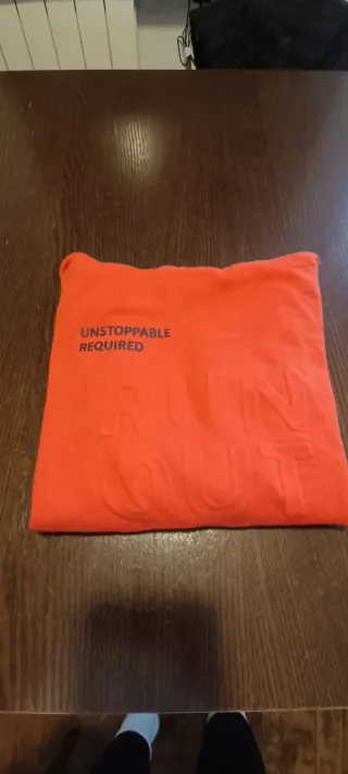 Sudadera infantil de Zara en color naranja vibrante. Presenta un diseño con texto en relieve. TALLA 13-14 AÑOS manga media. - Texto en relieve RUN OUT. - Texto UNSTOPPABLE REQUIRED en la parte superior.