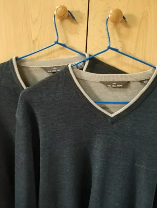 Pack de dos jerseys de Zara Man en color gris. Son de manga larga y cuello en pico. - 1 por 4€. - 2 por 6€. - Cuello en pico con ribete. - Manga larga.