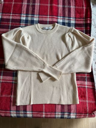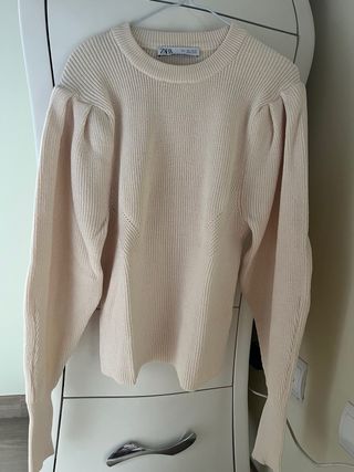 Jersey de punto de Zara en color beige. Presenta un diseño elegante con mangas abullonadas. - Cuello redondo. - Tejido de canalé. - Corte entallado.