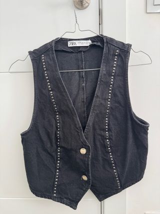Chaleco negro de Zara con tachas metálicas. - Diseño sin mangas. - Cierre de botones. - Detalle de tachas a lo largo del escote y los laterales. Puesto solo una vez.