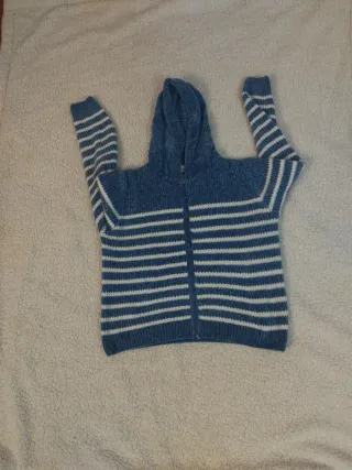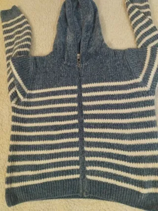 Chaqueta de lana con diseño de rayas. - Cierre de cremallera. - Capucha integrada. - Tejido de punto - Nueva puesta una vez. - Dos colores azul o rosa