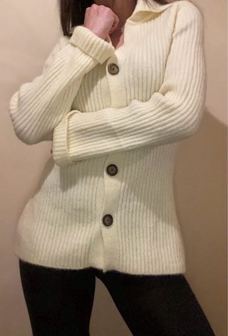 Precioso cárdigan abierto de lana en color crema. Es una prenda cómoda y versátil. - Diseño abierto. - Tejido grueso de lana - Cuello tipo solapa. Largo 63cm. Axila 40cm.