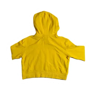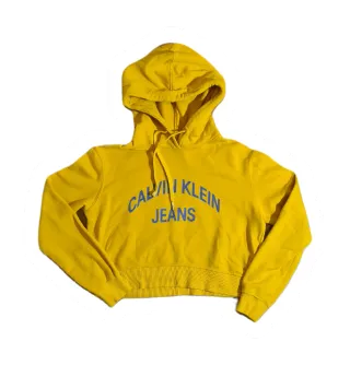 Sudadera corta de Calvin Klein Jeans en color amarillo vibrante. Un diseño moderno y cómodo. Tiene una pequeña mancha que apenas se ve en la parte delantera abajo - Corte cropped. - Logo de Calvin Klein Jeans estampado en el pecho. - Capucha con cordones. - Puños y bajo elásticos.