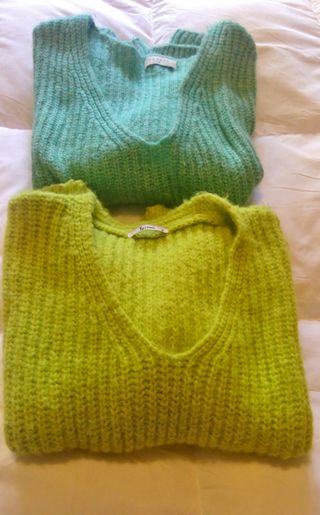 Conjunto de dos jerséis de punto con cuello en V. Preciosos colores ácidos: Verde menta y turquesa. Punto grueso, muy abrigados.
