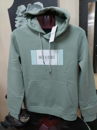 Sudadera con capucha de la marca Jack & Jones. Presenta un diseño moderno y cómodo. Con felpa por dentro Talla S 44cms de hombro 52cms de sisa o pecho 65cms de largo - Estampado frontal con el logo de la marca. - Capucha ajustable con cordones. - Puños y bajo elásticos.