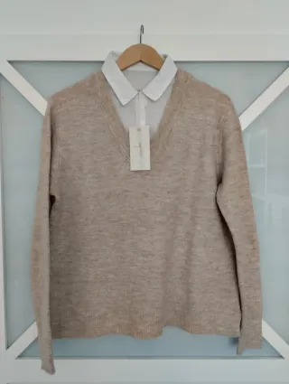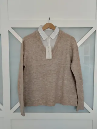 Jersey de punto fino con cuello de camisa blanco incorporado. Ideal para un look casual o más arreglado. Talla M 38. Nuevo con etiquetas. - Jersey de punto fino. - Cuello de camisa blanco.