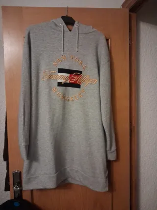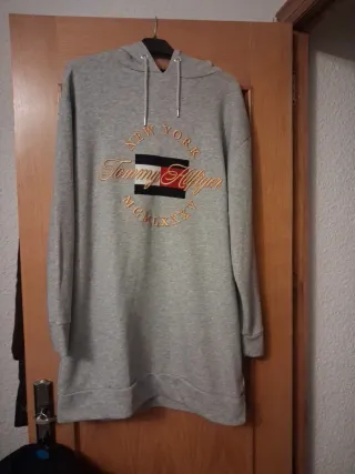 Vestido sudadera de la marca Tommy Hilfiger. - Color gris jaspeado. - Diseño con capucha y cordones. - Logo de Tommy Hilfiger bordado en la parte frontal. - Detalle de texto New York y MCMLXXXV alrededor del logo.