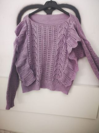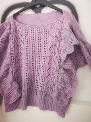 Jersey de punto con un diseño moderno y femenino. Perfecto para añadir un toque especial a tu armario. - Manga larga con volantes. - Tejido de punto con calados. - Cuello barco.
