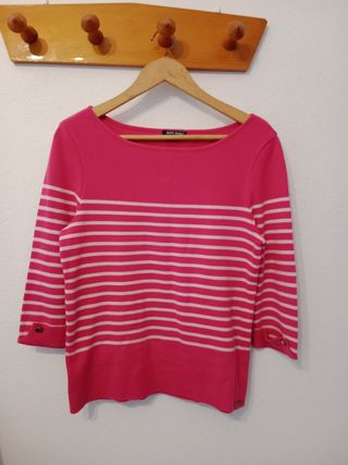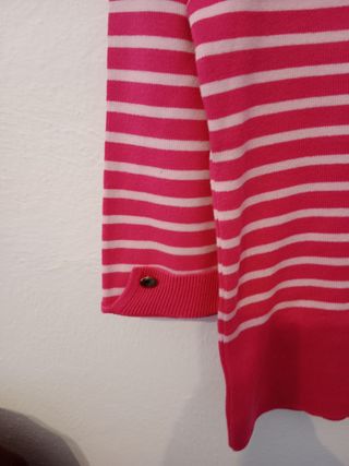 Dos jerséis nuevos a estrenar, talla XL. Uno beige con estampado de estrellas azules y otro rosa y blanco a rayas. Ambos son suaves y de punto ligero. - Tejido suave y ligero. - Estampados bonitos y actuales. - Perfectos para el entretiempo.