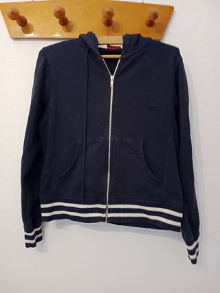 Preciosa sudadera con capucha de la marca Levi's, en azul marino y talla S. Es una prenda cómoda y de estilo clásico. - Cremallera frontal. - Puños y bajo de canalé con rayas blancas. - Bolsillo delantero tipo canguro.