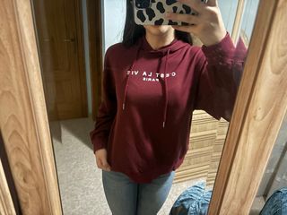 Sudadera granate con capucha y cordones. - Diseño con texto C'est la vie Paris en blanco. - Mangas largas con puños elásticos. - Tejido suave y cómodo. Si tienes alguna pregunta o quieres ver más fotos háblame 🫶🏻