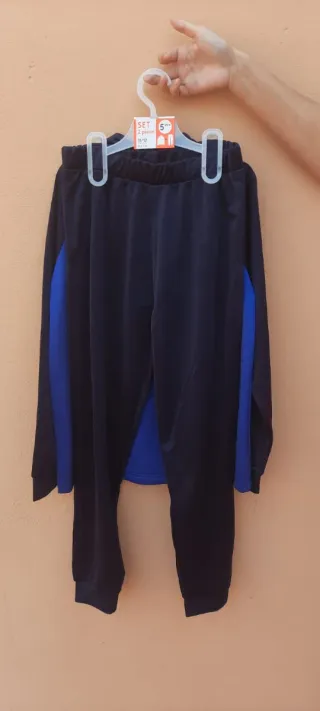 Conjunto deportivo de dos piezas. - Sudadera con cremallera y capucha. - Pantalón largo. - Diseño en color azul y negro.