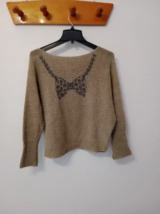 Jersey de punto en tono beige con un original estampado de lazo en la parte delantera. - Diseño de cuello barco. - Mangas largas. - Tejido de punto acanalado.