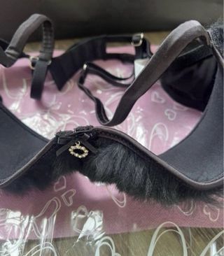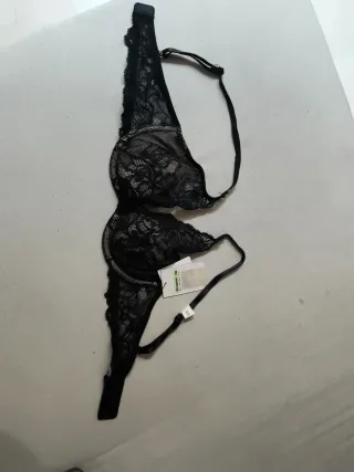 Conjunto de lencería de Victoria's Secret, compuesto por un sujetador y un tanga. - Tejido de encaje con detalles. - Tirantes del sujetador con adornos de pedrería. - Comprado en la tienda del aeropuerto de OPORTO el 19/12/2025, sin usar ni probar, lo vendemos porque no lo podemos devolver, ya que mi pareja se equivocó de talla, y al ser del aeropuerto solo lo podemos cambiar en Portugal y ya no va a volver allí porque vive en Valencia.