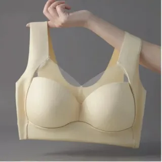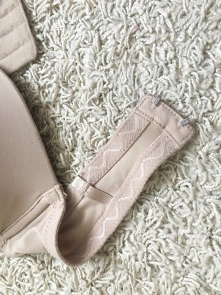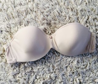 Sujetador sin tirantes en color beige. Diseñado para ofrecer soporte y comodidad. - Copas moldeadas. y se podría colocar una tira ajustable - Banda lateral transparente. con adherencia al cuerpo tiene algo de relleno talla amplio uso al ser abierto un margen de 80 a 100 y de copa B