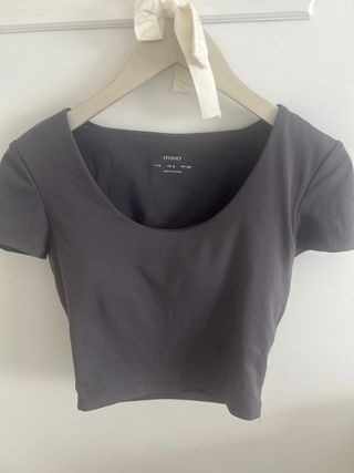 Camiseta deportiva de la marca Oysho, ideal para actividades físicas. Su diseño es cómodo y versátil. - Color gris. - Talla S. - Fabricada en China.