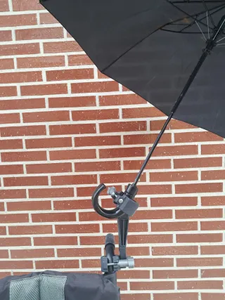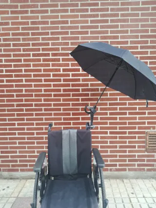 Accesorio práctico para sujetar tu paraguas o sombrilla a una silla de ruedas. - Diseño adaptable a diferentes diametros - agarre muy resistente - se puede cambiar la posición y orientación - precio nuevo 39,09 euros