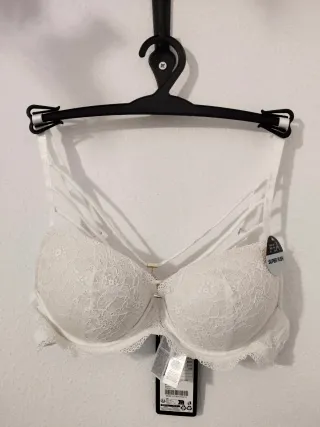 Sujetador blanco con detalle de encaje y tirantes. - Diseño super push up. - Detalle de encaje en las copas y el borde. - Tirantes finos y ajustables. Marca New Yorker (Censored).