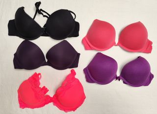 Lote de los 5 sujetadores NO SE VENDEN POR SEPARADO - 2 sujetadores WOMAN ́SECRET (Uno de color negro con relleno, tiras cruzadas en la espalda y apertura por delante) (Otro de color fucsia eléctrico con detalles de encaje bordado y gasa elástica) - Sujetador OYSHO color rosado, relleno y se puede cruzar las tiras en la espalda. - 2 sujetadores sin marca. Uno morado oscuro con relleno. Otro de color violeta y relleno. Todos tienen tirantes regulables y aros Entra en mi perfil y verás más ropa. 🔴10€ de dto. en la compra de dos o más artículos cuyo total supere 40€. Para recoger en el Parque Goya 2 de Zaragoza, o envío.