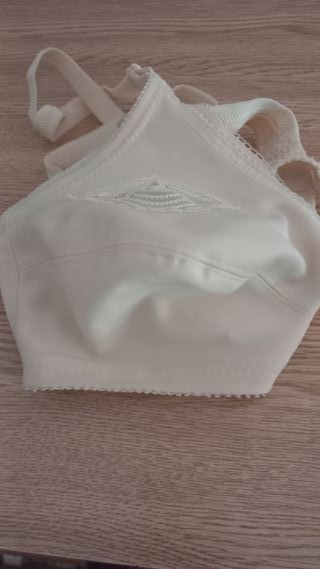 Sujetador de color beige. Usado, estado correcto. Tiene años. - Diseño clásico. Sin aros. No se ve la talla, pero es más bien grande.