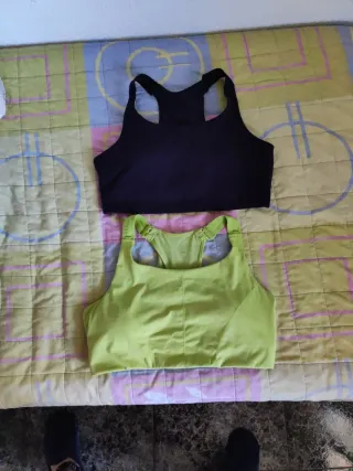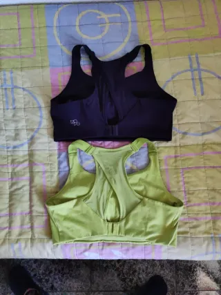 Pack de dos sujetadores deportivos H&M. Talla XL, sería una 100C/D aprox. - Uno de color negro. - Otro de color verde lima. Soporte fuerte. Vendo por no usar. Tienen muy poco uso (5 veces cada uno quizá). Precio original de cada uno 29,90€. Llévate los dos por 10€.