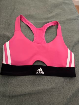 Sujetador deportivo Adidas en color rosa vibrante con detalles de rayas blancas. - Diseño con tirantes tipo racerback. - Banda inferior ancha y elástica con logo. - Rayas blancas icónicas en los laterales.