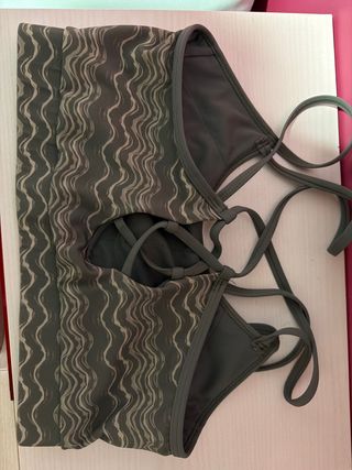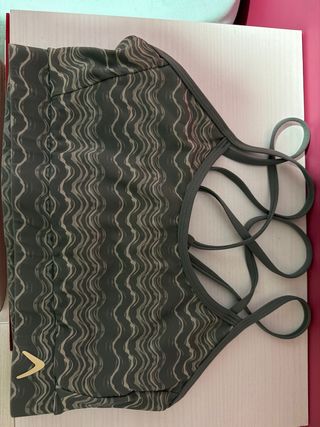 Top deportivo con un diseño original y moderno. - Estampado ondulado en tonos beige y verde oliva. - Talla S. - Tirantes cruzados en la espalda.
