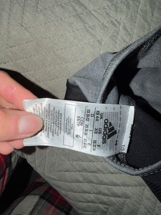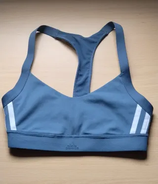Sujetador deportivo de la marca Adidas en color gris. Diseñado para ofrecer comodidad y soporte. - Diseño con tirantes cruzados en la espalda. - Detalles de las tres rayas icónicas de Adidas en los laterales. - Banda elástica inferior para un ajuste seguro. -Es pequeño, tipo la S