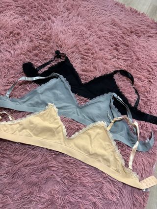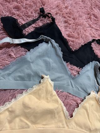 Pack de tres sujetadores de lactancia, nuevos y sin usar. - Diseño cómodo y funcional. - Tirantes ajustables. - Cierre de clip para facilitar la lactancia.