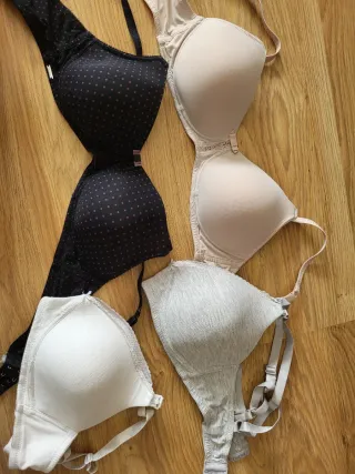 Conjunto de cuatro sujetadores diseñados para la lactancia. Son cómodos y prácticos para el día a día. Usados pero en buen estado. 2 sujetadores de la marca Variance y 2 sujetadores de h&m. - Diseño con estampado de lunares. - Detalle de encaje en el borde superior. - Cierre frontal para facilitar la lactancia.