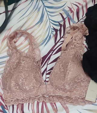 Sujetador de lactancia de la marca Oysho, talla 90C. Esta en buen estado pero se ha descosido un poco un lateral que se puede coser fácilmente. De ahí su precio - Tirantes ajustables. - Cierre de clip para lactancia. - Detalle de encaje en los laterales.