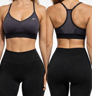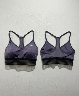 Top deportivo Nike en color gris antracita. Presenta un diseño con tirantes y banda inferior. - Tejido con textura jaspeada. - Detalle de malla en la parte frontal. - Banda elástica inferior con líneas horizontales. Talla S. #Topdeportivo #nike #nikePro