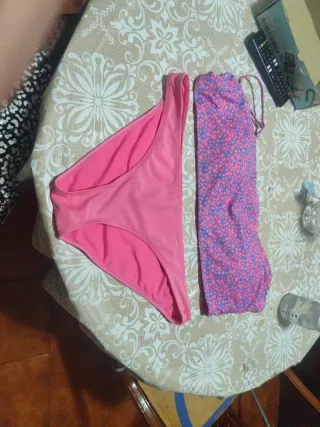 Conjunto de bikini de dos piezas. El sujetador es tipo floral talla 2XL ( comprado por error) gasto talla L Y braguita rosa talla L pero talla más grande porque me viene grande