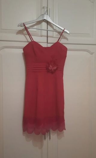 Precioso vestido de cóctel en color fucsia. Ideal para eventos especiales. - Las tirantas son ajustables. - La flor va sujeta con un imperdible - Bajo con ondas. - Perfecto estado.