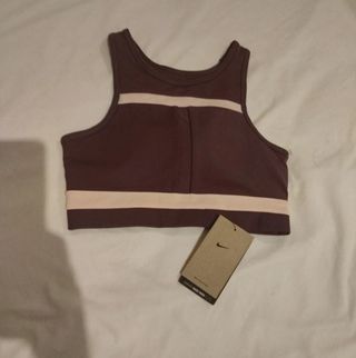 Sujetador deportivo de la marca Nike en color blanco talla S. Diseñado para ofrecer comodidad y soporte. - Tejido transpirable. - Diseño sin mangas. - Logo de la marca visible.