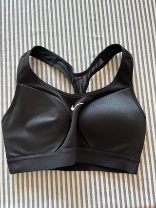 Sujetador deportivo Nike de color negro. - Diseño con tirantes cruzados en la espalda. - Logo de Nike en contraste en el pecho.