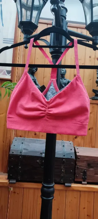 Sujetador deportivo con un diseño moderno y cómodo. - Tirantes cruzados en la espalda. - Detalle fruncido en la parte delantera. - Banda inferior elástica. Posiblemente usado solo una vez.