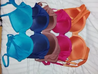 Conjunto de cinco sujetadores de diferentes colores. Talla 80B - Sujetador naranja - Sujetador rosa - Sujetador marrón - Sujetador azul marino - Sujetador azul turquesa