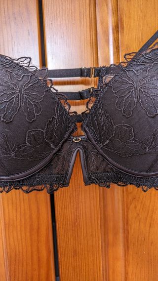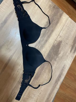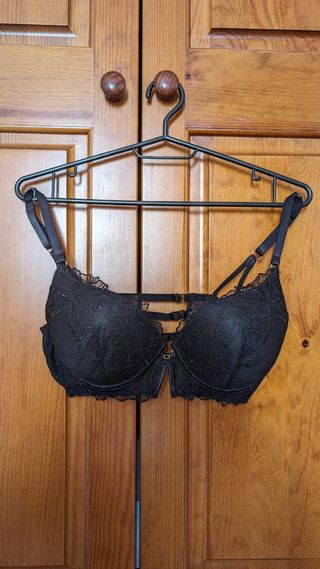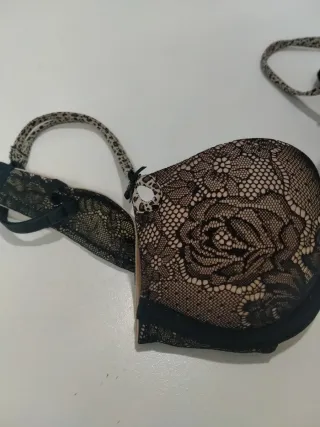 Sujetador negro, con adorno de encaje en rosita palo. Es push up. No sé la talla porque corte la etiqueta, pero quizás ronde la 90-100. Mide 36cm aproximado de contorno. Puesto un par de veces. IMPORTANTE: escribir solo personas interesadas en comprar. Leer bien los anuncios, explico bien lo que esta usado y lo que no, y NO, no voy a usar nada ahora para mandártelo porque simplemente no me cabe, por eso lo vendo.