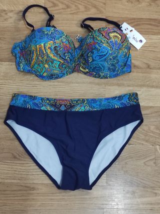 Precioso bikini de dos piezas. La parte superior es un sujetador tipo balconette y la braga es de talle alto. - El bikini está en perfecto estado. - Tiene un estampado paisley multicolor sobre fondo azul marino. - Ideal para lucir este verano.