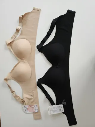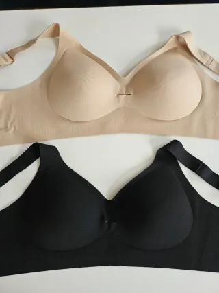 Pack de dos sujetadores sin estrenar, uno en color negro y otro en tono visón. - Diseño sin costuras. - Tirantes ajustables. - Copas con relleno. - Muy cómodos.