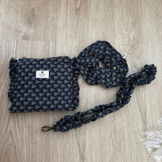 Preciosa funda de cosméticos (o bolsito de mano), scrunchie y cuelga movil de la marca Nanai. Son de color azul con estampado blanco. La funda tiene un diseño con volantes y cierre de cremallera. El scrunchie es ideal para sujetar el pelo. El cuelga movil es univerdal, trae un plastico adaptador para todos los moviles. Se venden juntos.